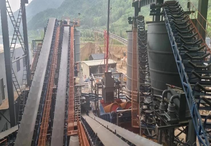 生产线主设备配置:HVS128颚破*1台,HSP1650高效高速圆锥机*2台,HL630立轴式冲击破*2台,3YAQ3072振动筛*4台,洗砂机*4台,脱水细砂回收一体机*2台。